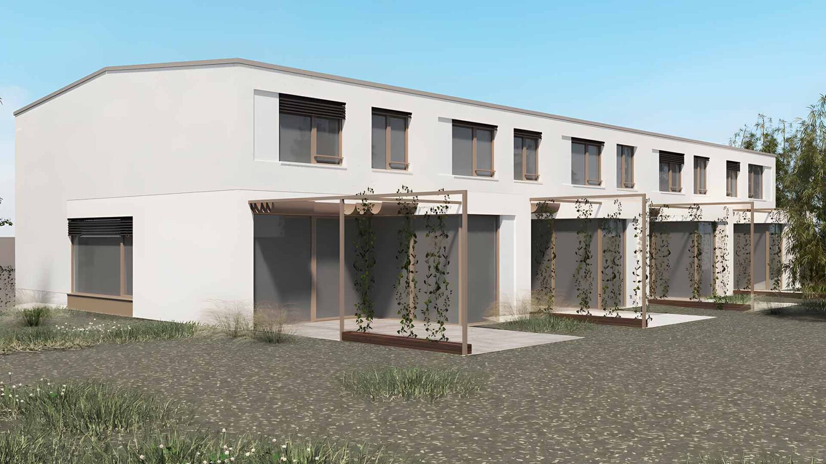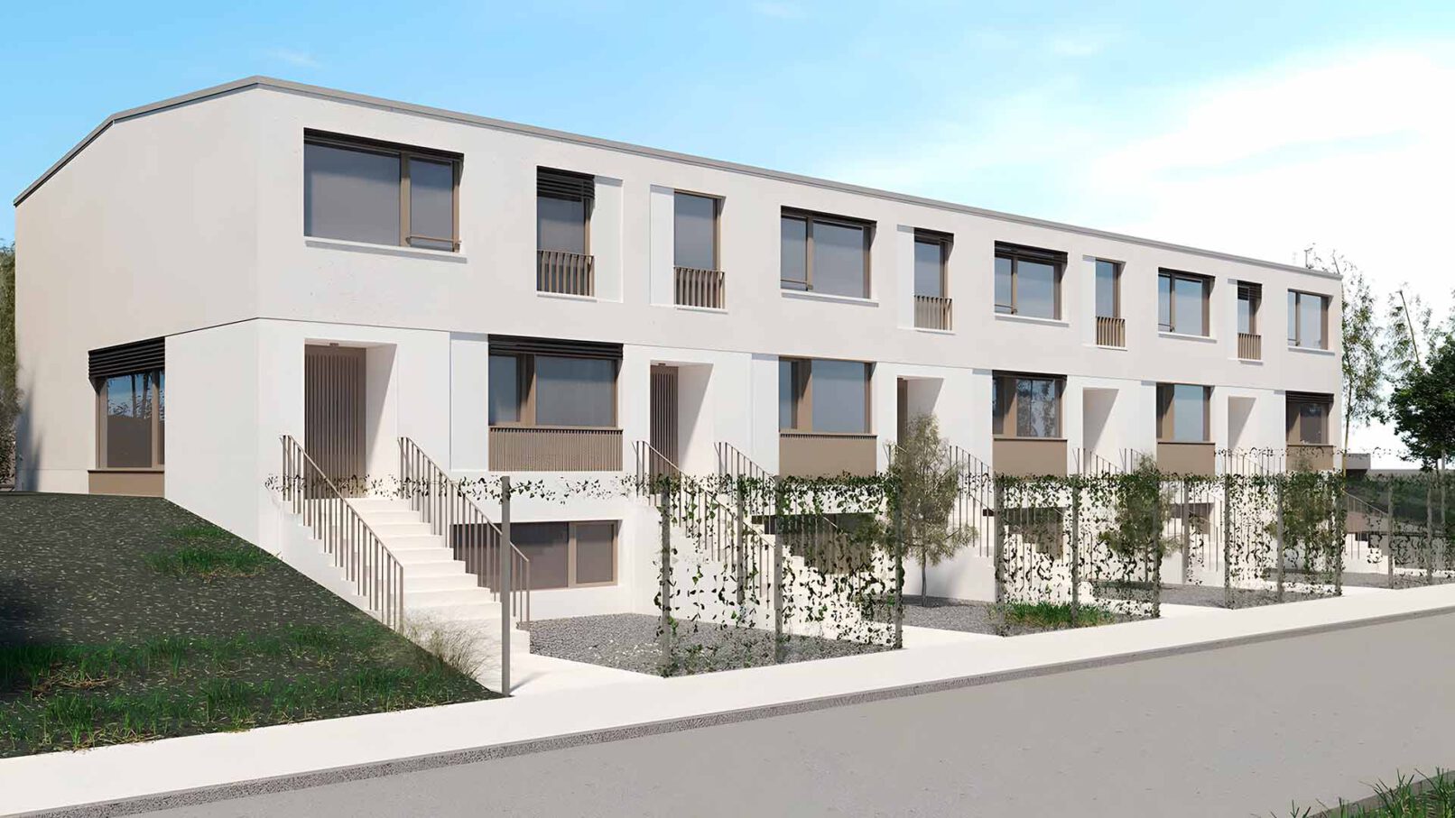 In Wiesendangen in der Kehlhofstrasse werden auf grüner Wiese 10 Reihenhäuser auf einer gemeinsamen Tiefgarage erstellt. Die Häuser haben eine zentrale Wärmeerzeugung mit Erdsonden und Wärmepumpe. Vom Heizraum neben der Tiefgarage erfolgt die Verteilung auf die einzelnen Häuser. Es ist pro Haus eine PV-Anlage mit je 15 PV-Modulen möglich. So könnten pro Jahr 5‘400 kWh Strom solarerzeugt werden. Die Fassaden sind mit einer Kompaktfassade mit unterschiedlichen Putzstrukturen angedacht. Der Sockel erhält einen abgefilzten Verputz. Die darüber liegenden Fassadenflächen werden mit einem Waschputz verputzt. Dessen Oberfläche erhält keinen Anstrich. Die Fenster werden in Kunststoff-Metall ausgeführt. Für den Innenausbau stehen 3 Stile zur Auswahl: Kontrast, Neutral und Komposition. Von „less ist more“ über „clean and flexible“ zu „fresh and creative“ sind, je nach Geschmack der Käufer, mehrere Ausbaumöglichkeiten vorhanden. In der Umgebung sind neben den Gemeinschaftsflächen grössere, geschützte Individualbereiche vorgesehen.